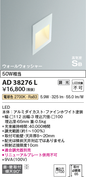 ●幅-□112 出幅-3 埋込穴径-□100 埋込深-65mm 重-0.5kg